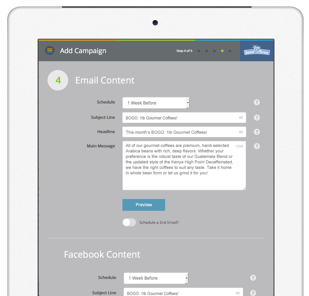 Franchisees use a mobile-driven admin to select, personalize, activate and track campaigns.
